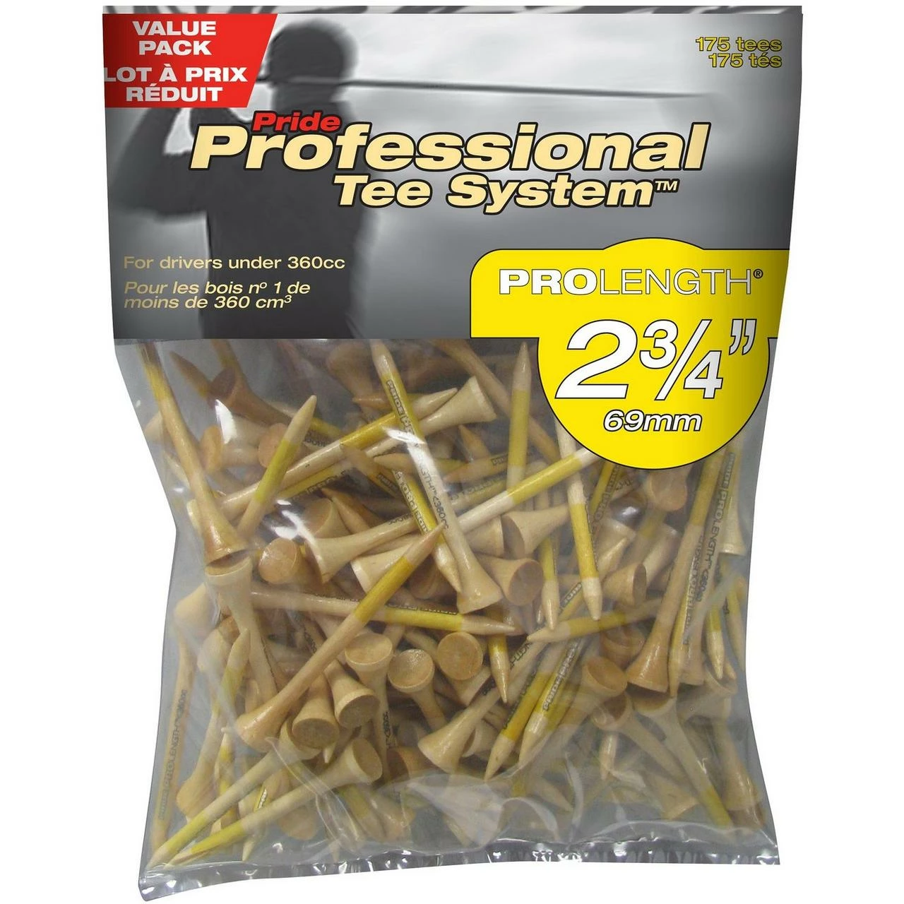 Pride Professional Tee System (PTS) is a proprietary system of color coded golf tees that allows for easy identification of tee length and appropriateness for various golf clubs. Use the Pride Golf Tee Co. Prolength 2 3/4 Natural Golf Tees with 3, 4 and 5 woods and drivers under 360cc.